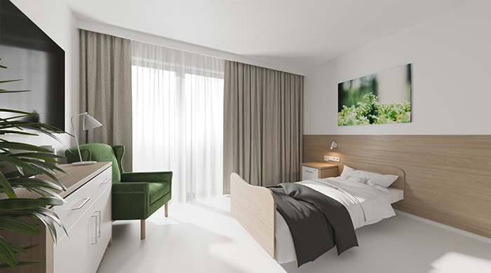 • Zimmer, die wie Hotelzimmer ausgestattet und eingerichtet sind, um eine angemessene Aufenthaltsatmosphäre zu schaffen
